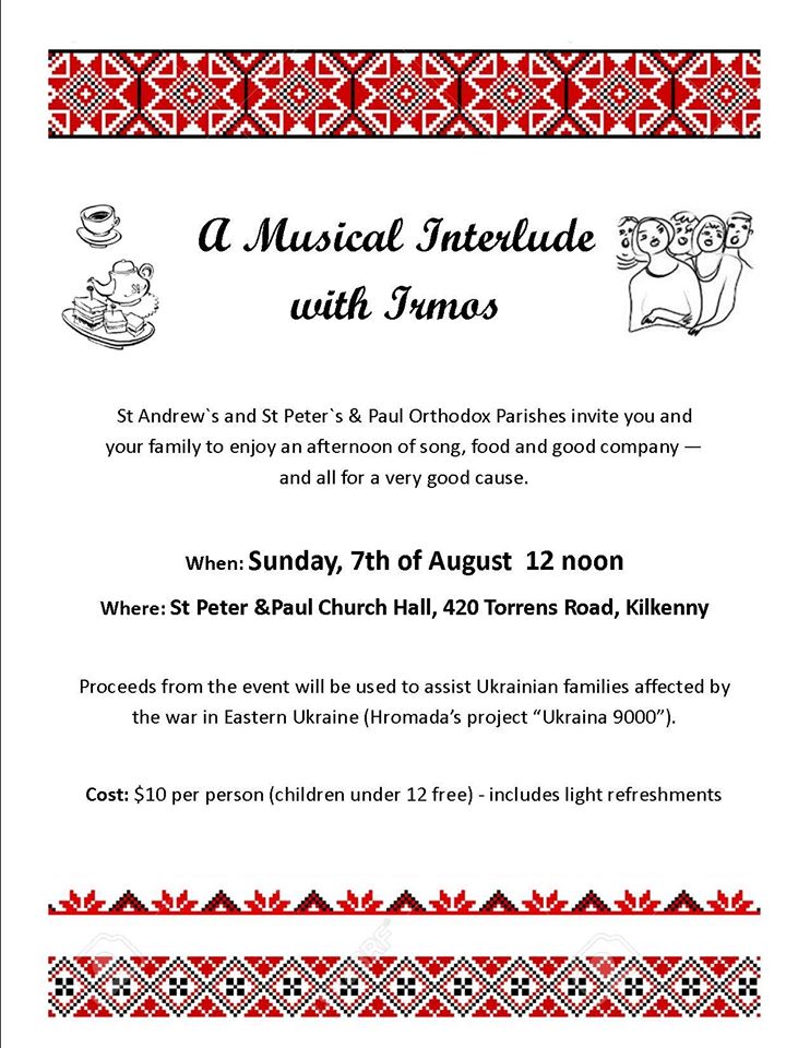 | Details | St Andrew’s and St Peter’s & Paul Orthodox Parishes invite you and your family to enjoy an afternoon of song, food and good company – and all for a very good cause.