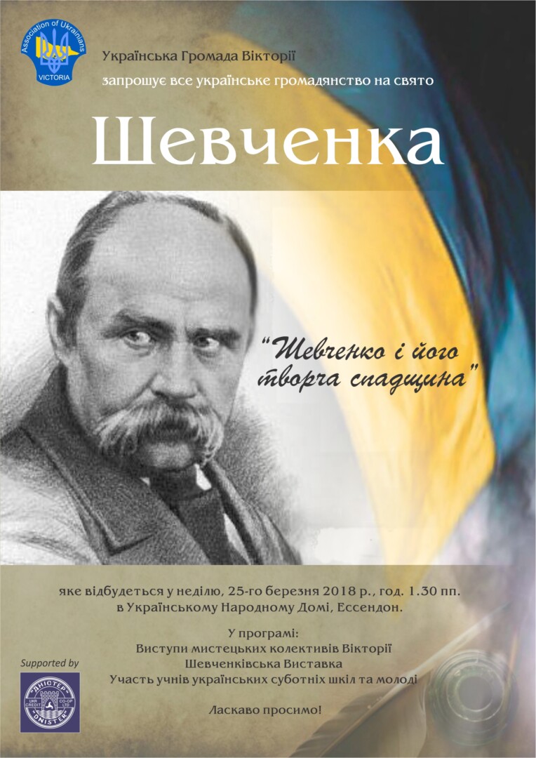 | Details | The Association of Ukrainians in Victoria invites you to celebrate the spirit of our greatest literary icon Taras Shevchenko. |