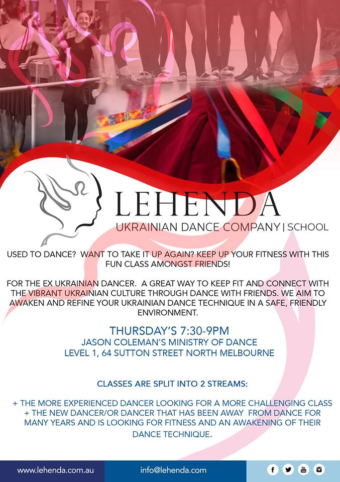 | Details | For the ex Ukrainian dancer. A great way to keep fit and connect with the vibrant Ukrainian culture through dance with friends. We aim to awaken and refine your Ukrainian dance technique in a safe, friendly environment. |