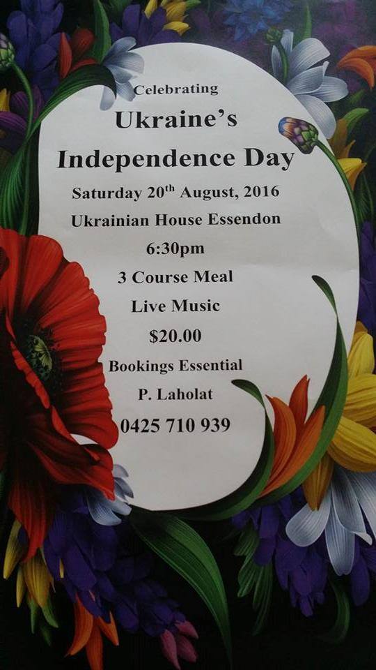 | Details | У суботу 20-го серпня в Українському Народному Домі в Ессендоні відбудеться забава з вечеою та музикою з нагоди Дня Незалежності України. Вступ тільки $20. На Вас чекає гарна музика, смачна вечеря та веселе товариство. Потрібно зарезервувати місце чим скоріше. Дзвоніть до пані Параскевії Лаголат, тел. 0425710939Come and join to celebrate Ukraine’s Independence Day! – 3 course meal – Live music Please book your table with P. Laholat on 0425 710 939 |